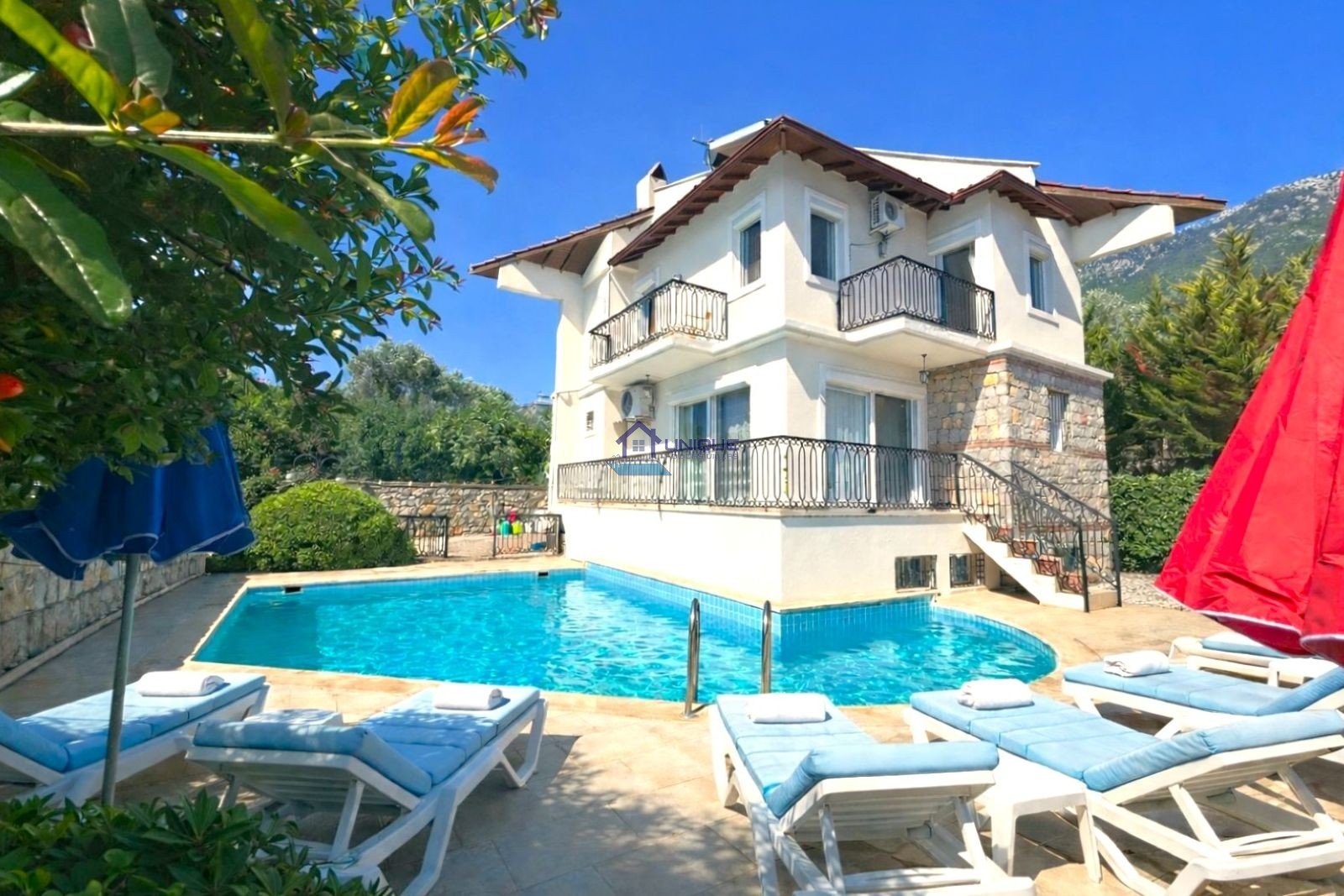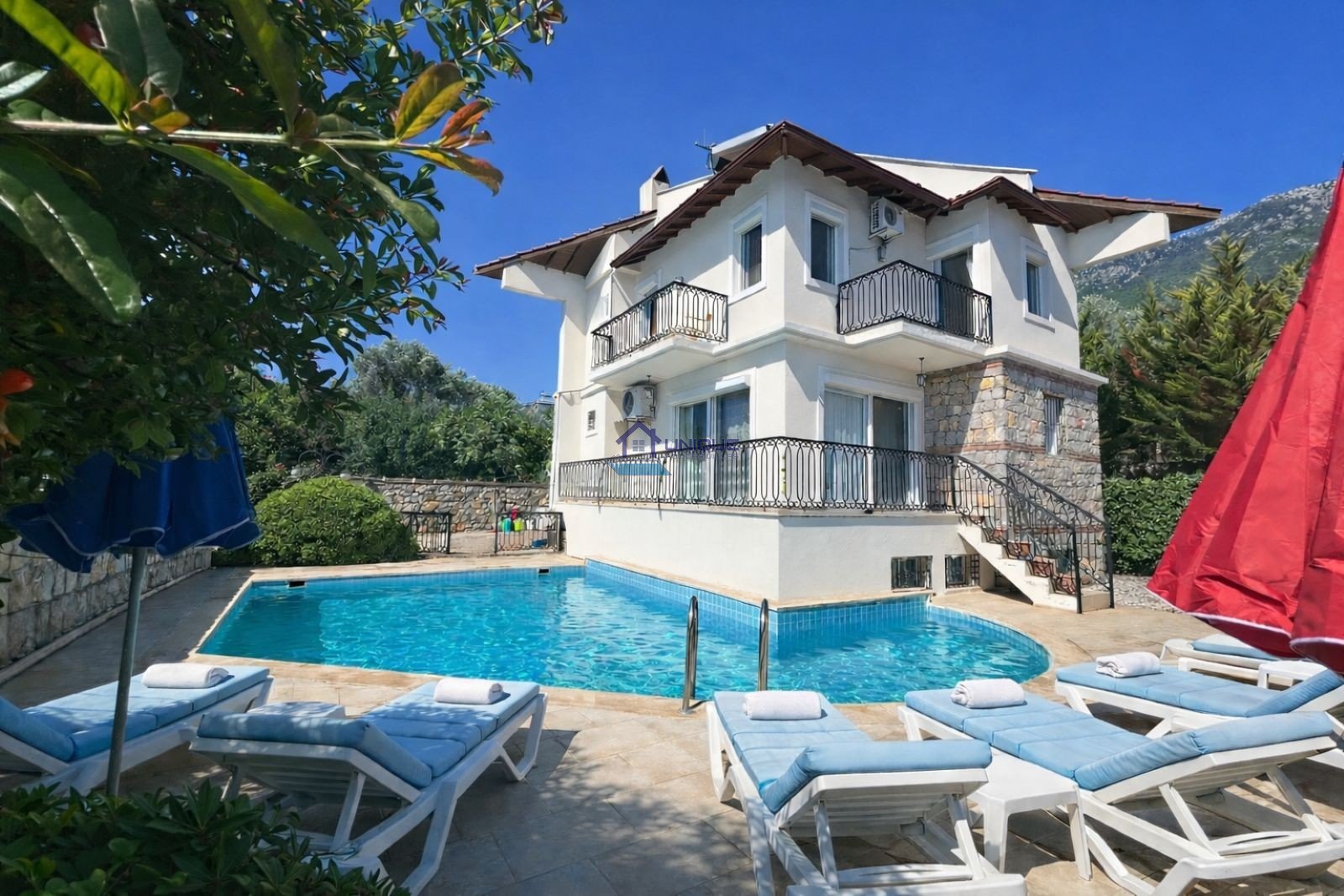 With a capacity of up to 8 guests, this Ölüdeniz rental villa offers 4 bedrooms, 3 fully equipped bathrooms, and 1 WC. Designed especially for large families, the villa combines privacy and comfort, making it a perfect choice among Fethiye villa rental options.