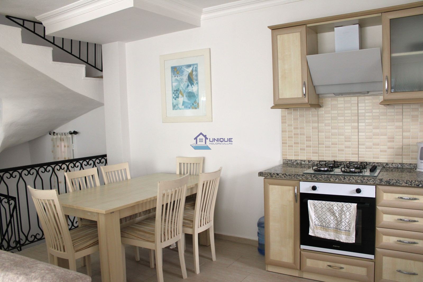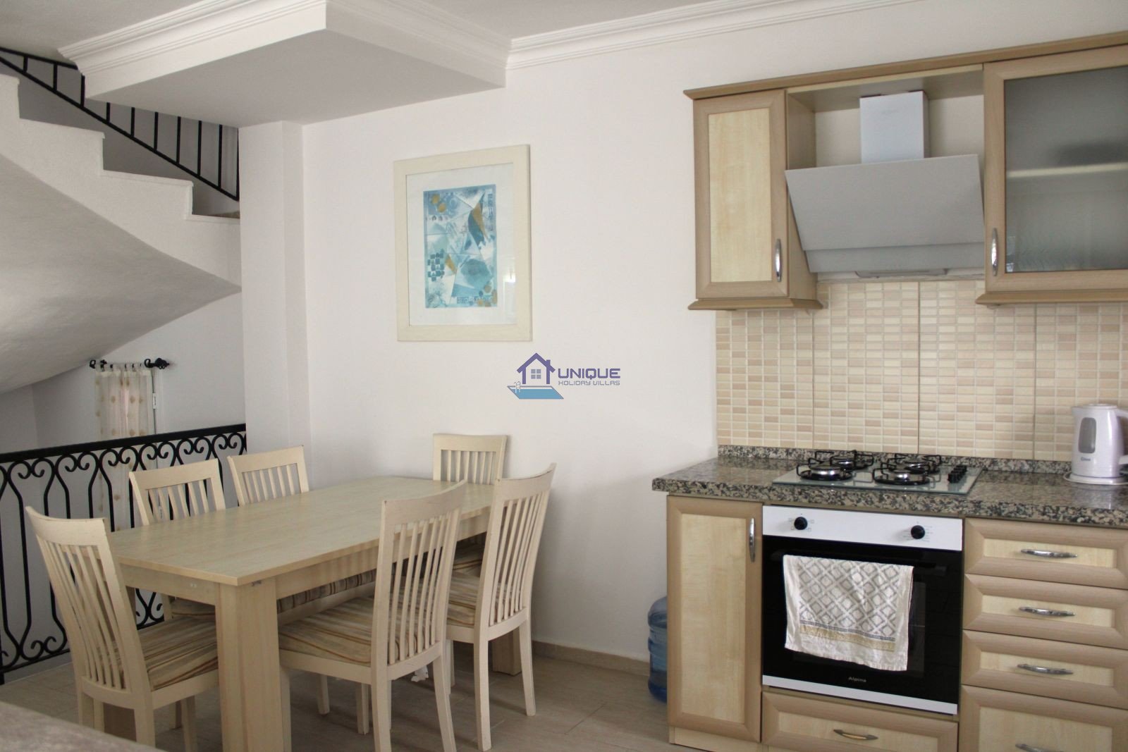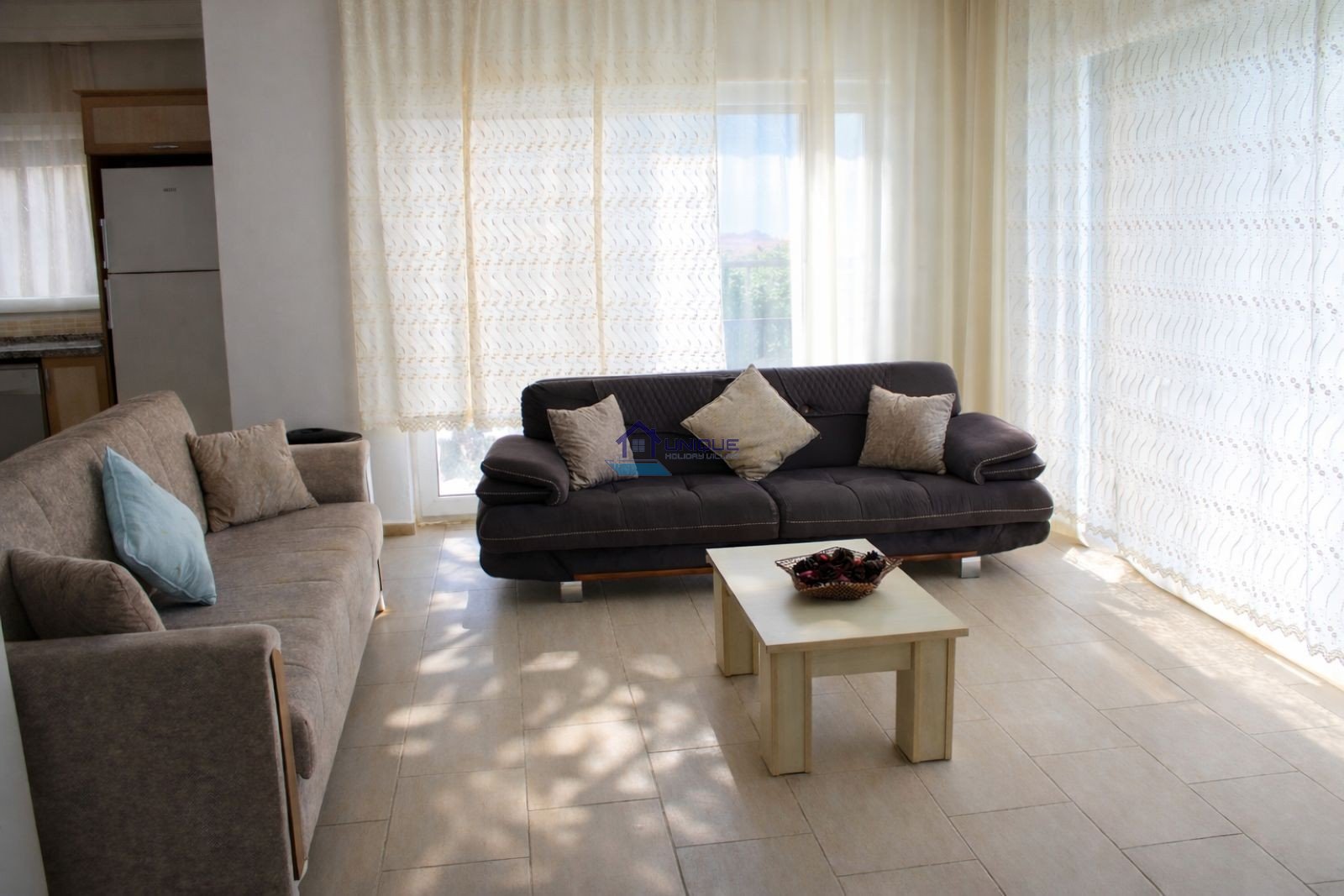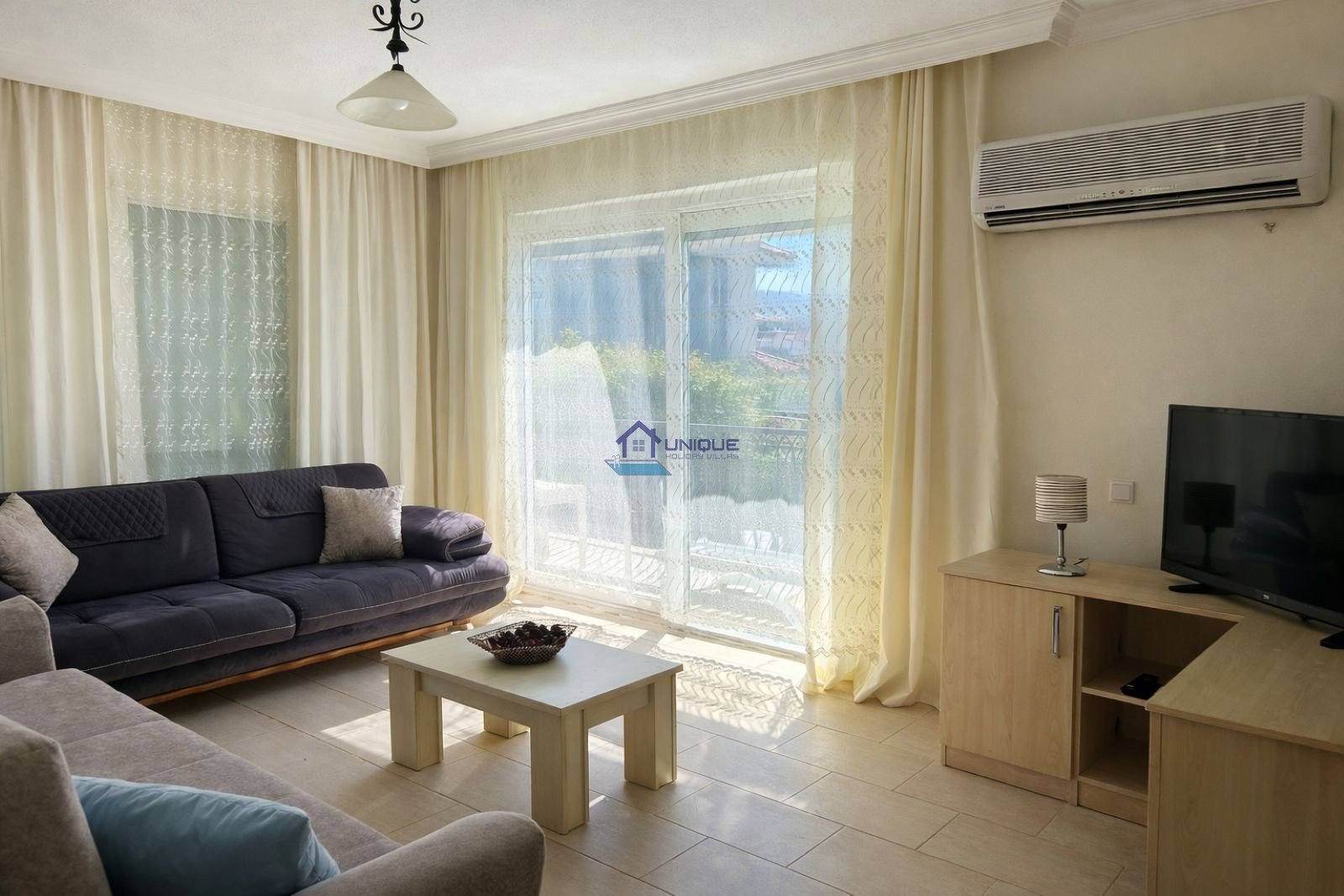 The bright and airy living room, fully equipped open-plan kitchen, and pool-facing balcony create a welcoming atmosphere for an unforgettable Ölüdeniz holiday. Access to the villa is provided via 6–7 steps at the entrance.