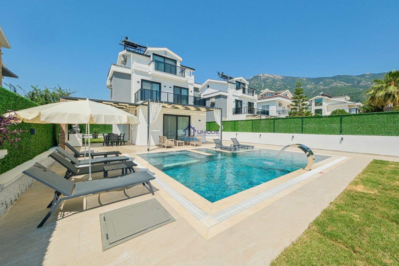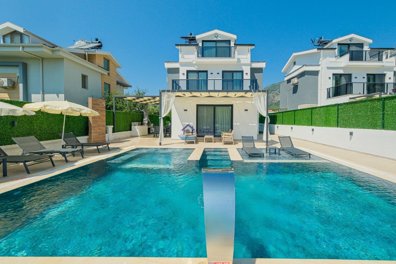 Villa ZHR01 is one of the most outstanding options among Oludeniz villa rental properties, offering a luxurious and modern accommodation experience in one of Fethiye’s most popular holiday regions. This triple-storey private villa for rent features 3 spacious bedrooms, each equipped with an en-suite bathroom, making it ideal for families and groups seeking comfort and style in a rental villa in Ovacik.