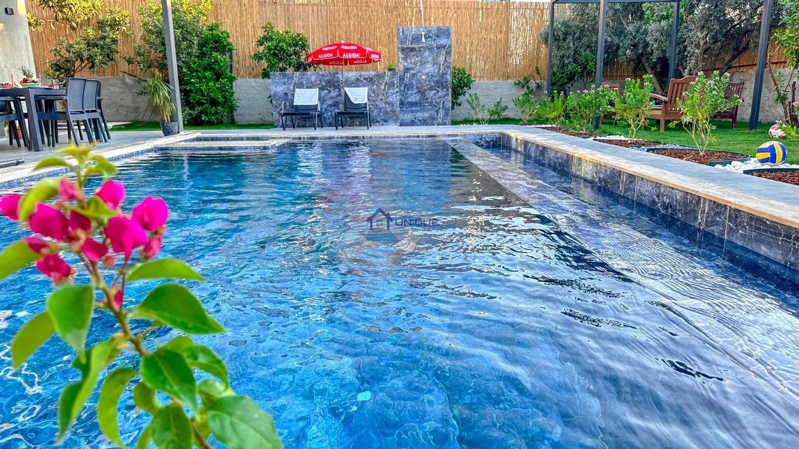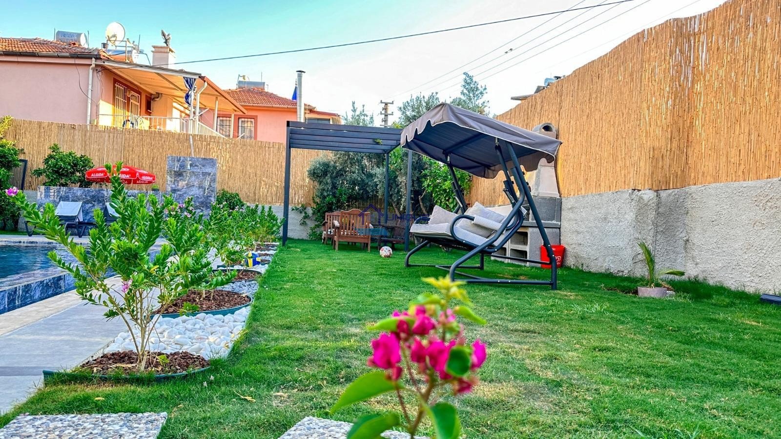 Outdoor Area & Garden: Villa CATAL offers a 590 m² private garden, perfect for relaxing outdoors. The garden includes a main outdoor non-heated swimming pool, a children’s pool with shallow section, pool steps for easy access, a gazebo, swing, BBQ area, and a poolside terrace with dining table and chairs. There is also a private open parking area for 2 vehicles at the entrance of the garden.