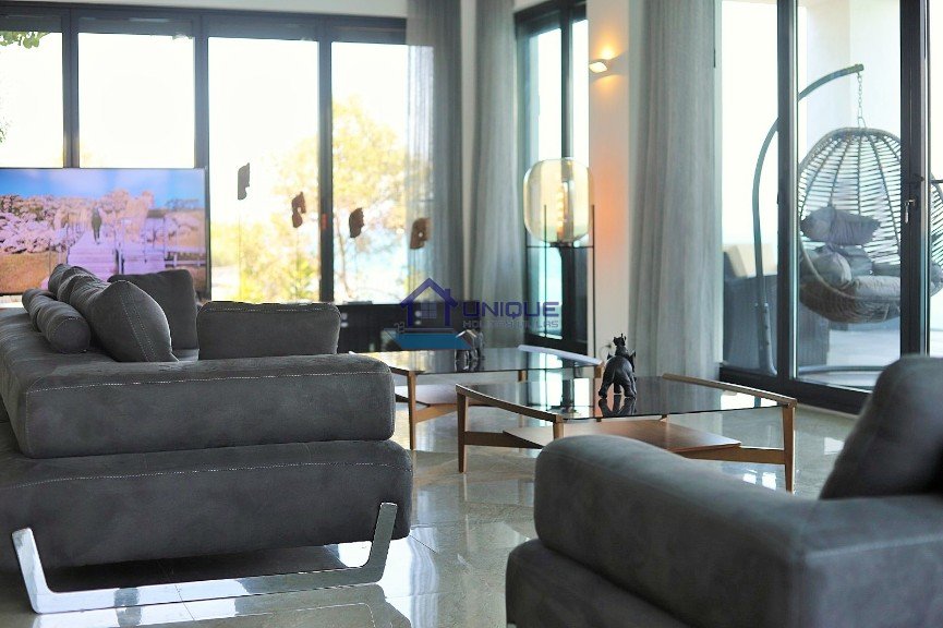 The sea-view living room also includes air conditioning, TV and a WC-bathroom.