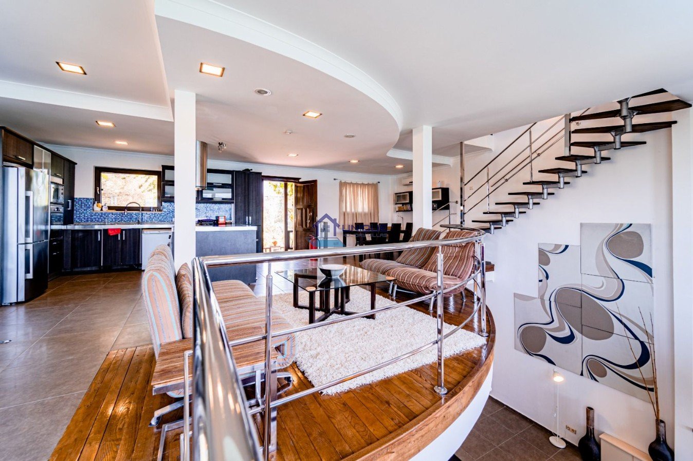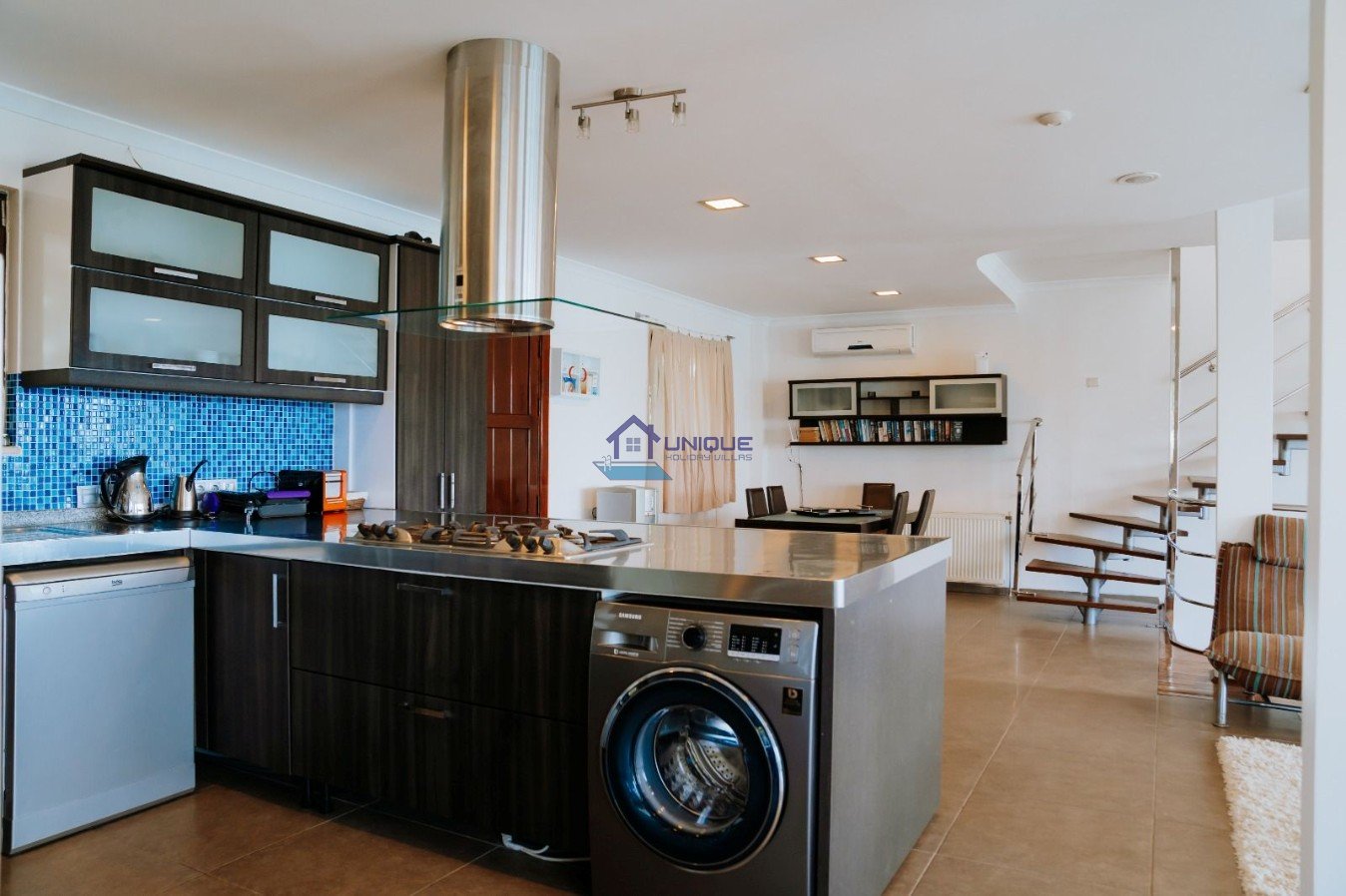 The villa offers a fully equipped open-plan kitchen and 3 en-suite bedrooms: