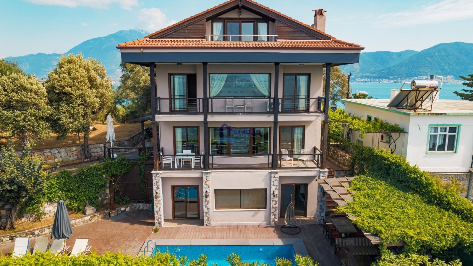 The villa is just a 3-minute boat ride from Calis Beach. Thanks to its panoramic views over Fethiye Bay and the open sea, you can enjoy unforgettable sunrises and sunsets every day.