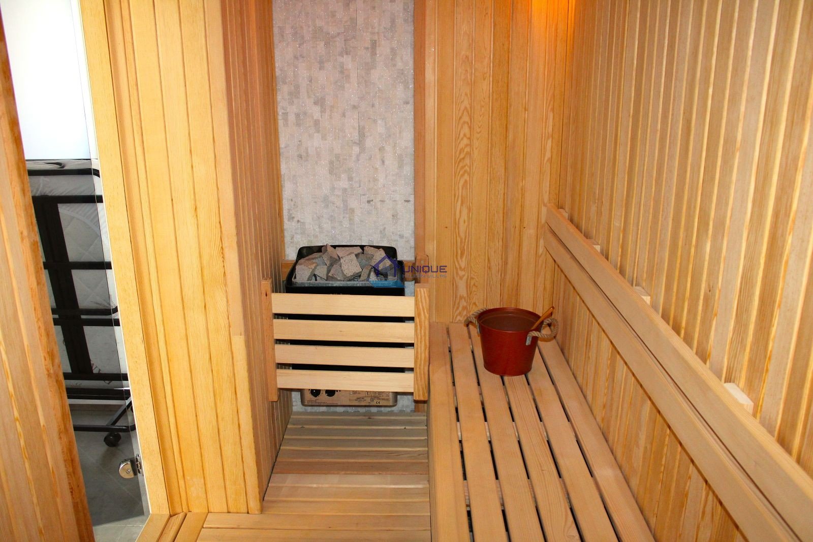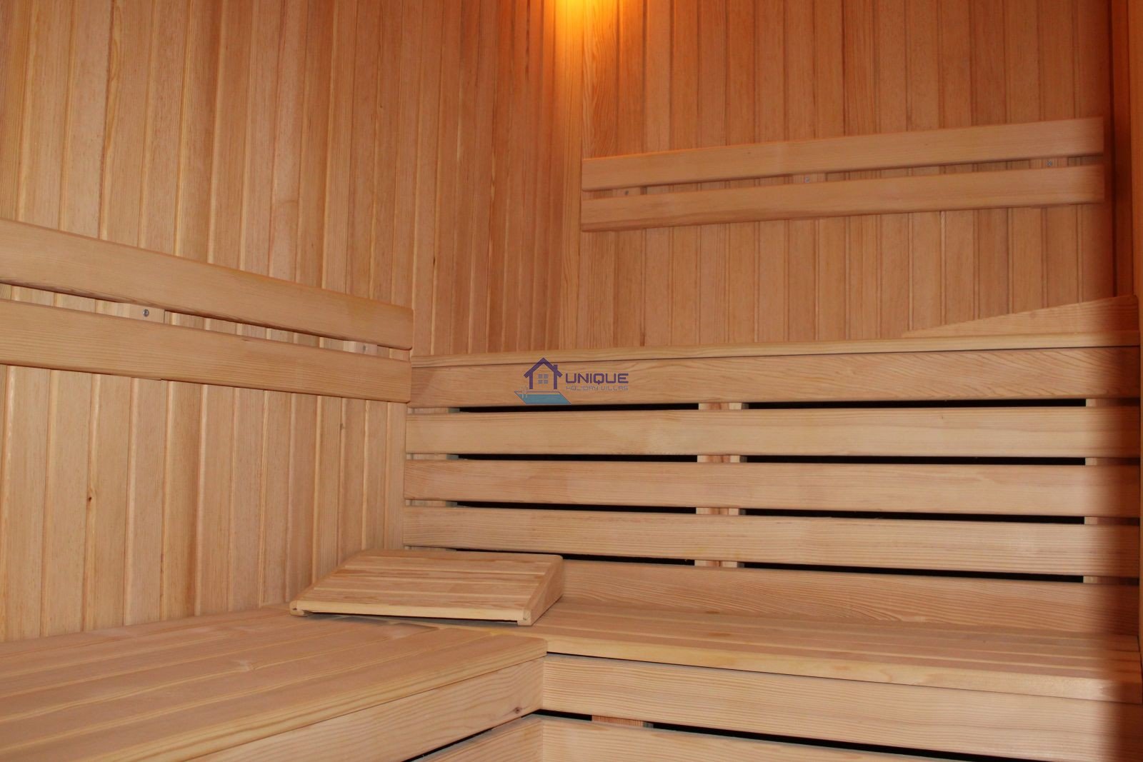 On the first floor; you’ll find two en-suite bedrooms, each furnished with a double bed, TV, air conditioning, and wardrobe. This floor also features a private sauna, ideal for relaxing after a sunny day by the pool.