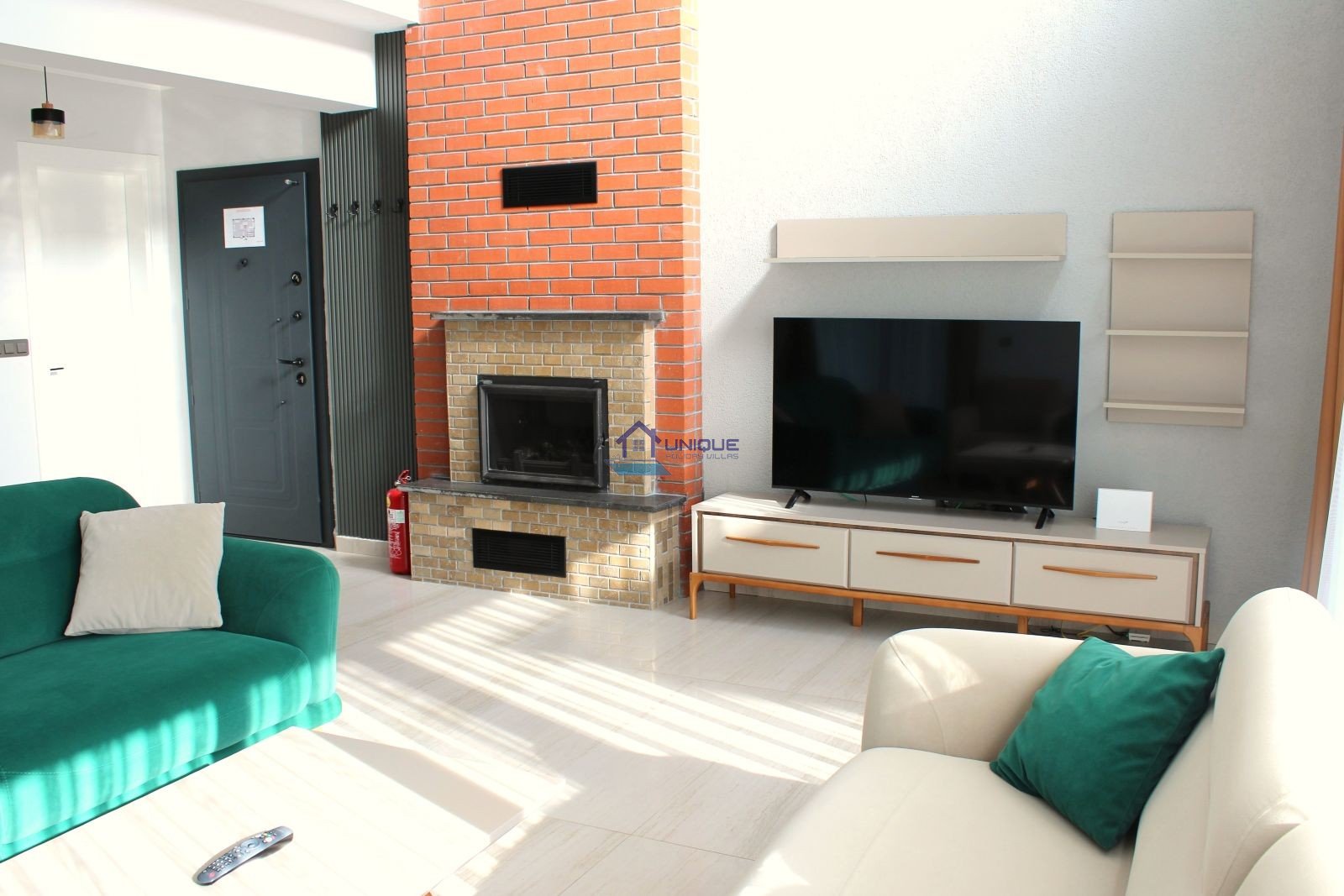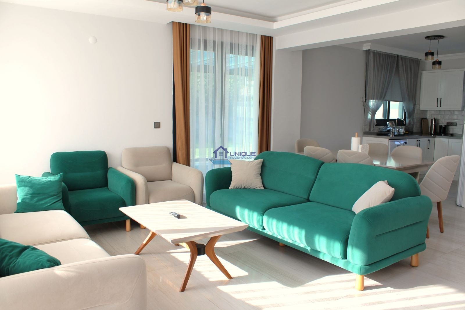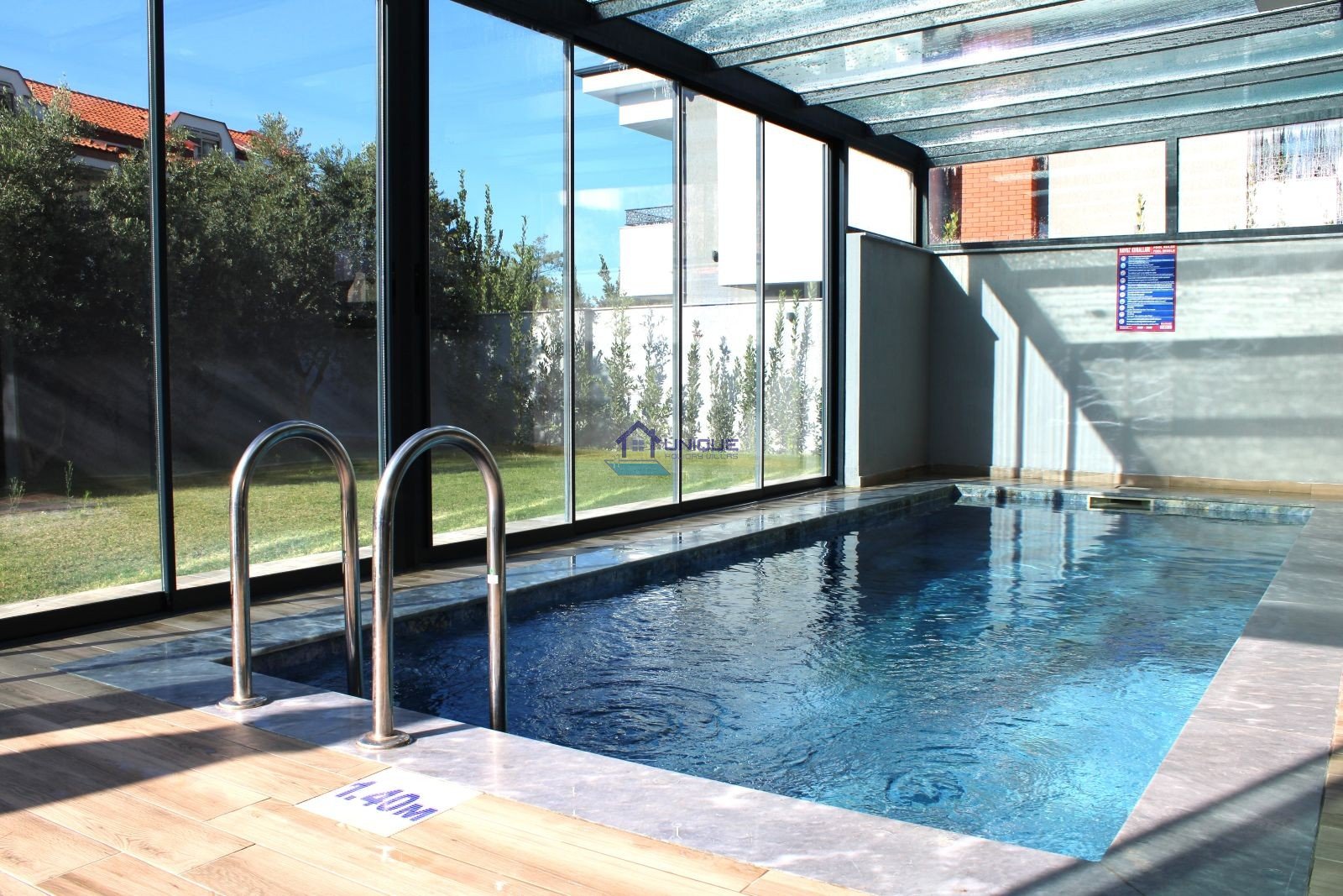 The ground floor features a large living area, smart TV, fully equipped kitchen, shared WC, and direct access to the heated indoor pool. Wide terrace doors open to the garden and outdoor swimming pool, making this property perfect for those searching for a heated pool villa or warm pool villa near Oludeniz.