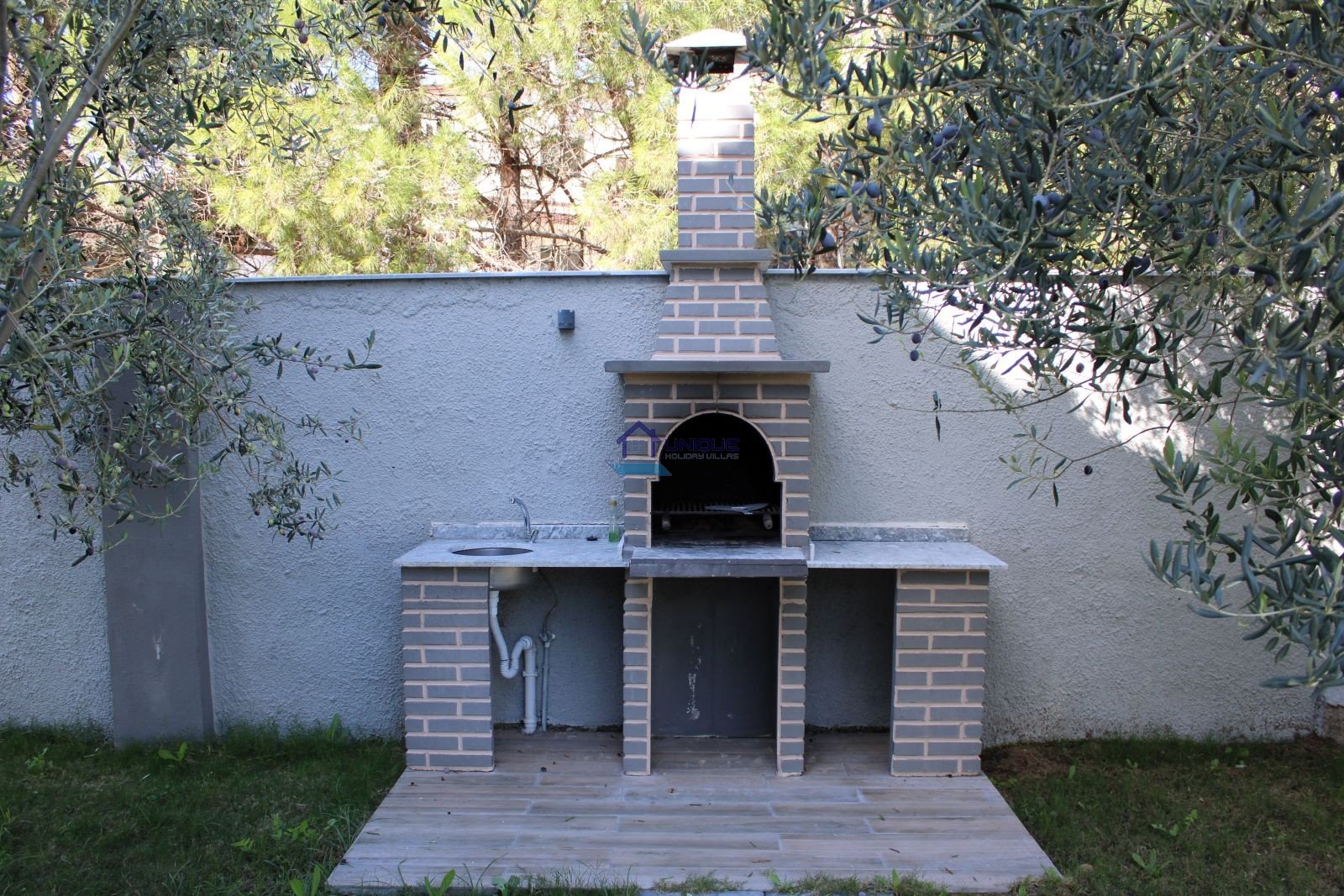 In the lush garden, you’ll find a private swimming pool, children’s pool, BBQ area, sun loungers, outdoor dining set, green lawn, and private parking.