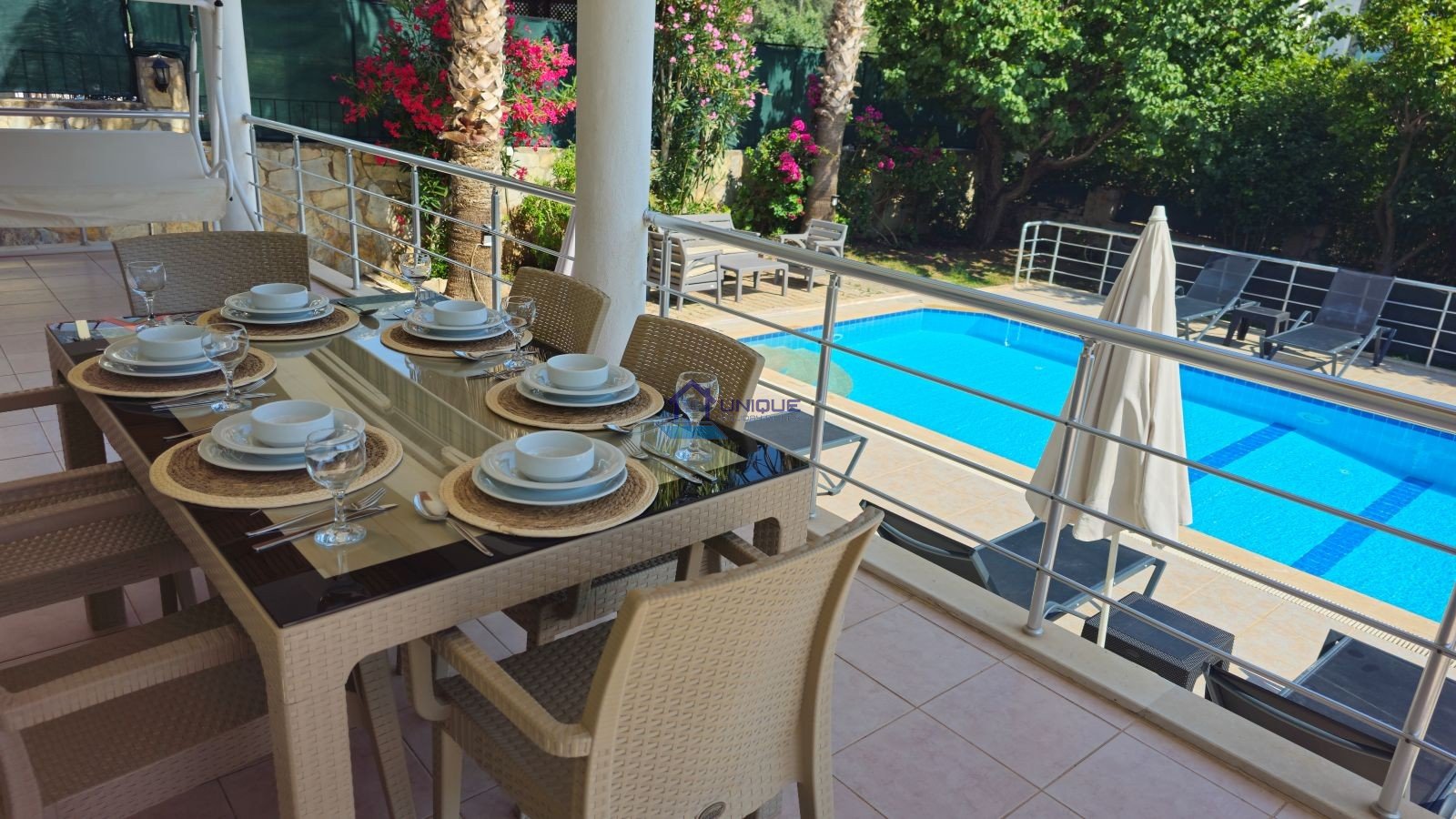 The exterior area of Villa ERTK1 offers everything needed for a peaceful and enjoyable holiday: Large private swimming pool, sun loungers, BBQ area, private parking, spend your days sunbathing, swimming, or relaxing under the shade; and enjoy evenings on the veranda watching the sunset over the Ovacik landscape.