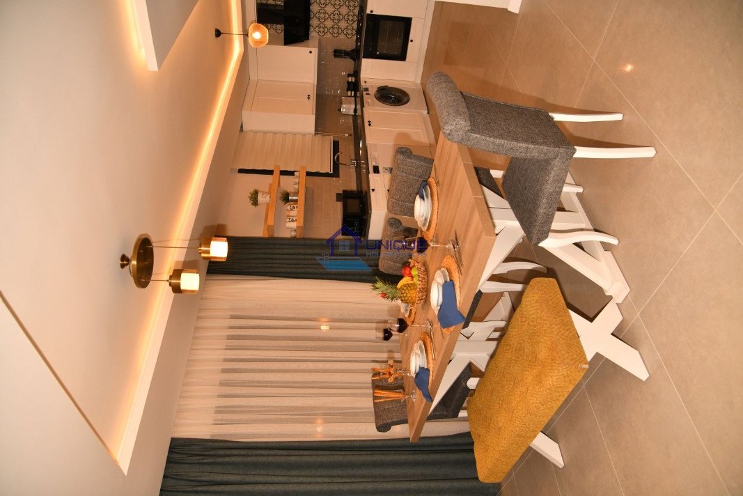 Ground Floor: Fully equipped open kitchen, cozy living area with veranda access, dining space, and shared WC.