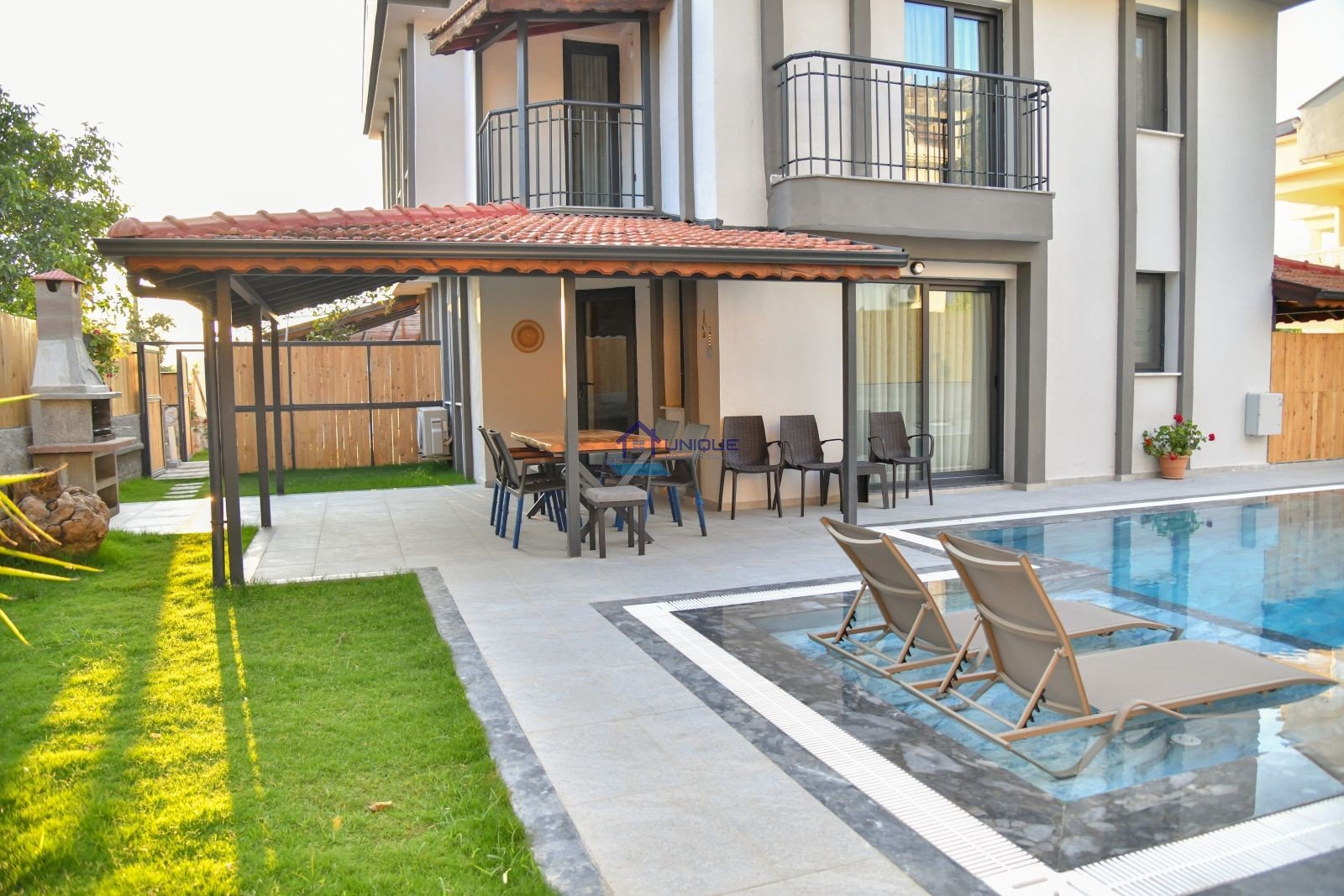 Villa KAYA2 is one of two adjoining duplex villas, each with its own private garden and swimming pool. The outdoor area includes sun loungers, umbrellas, a dining table, seating area, and a BBQ corner – perfect for relaxing under the Mediterranean sun. It’s a great choice for those searching for a private pool villa in Hisaronu or a quiet villa holiday in Fethiye.