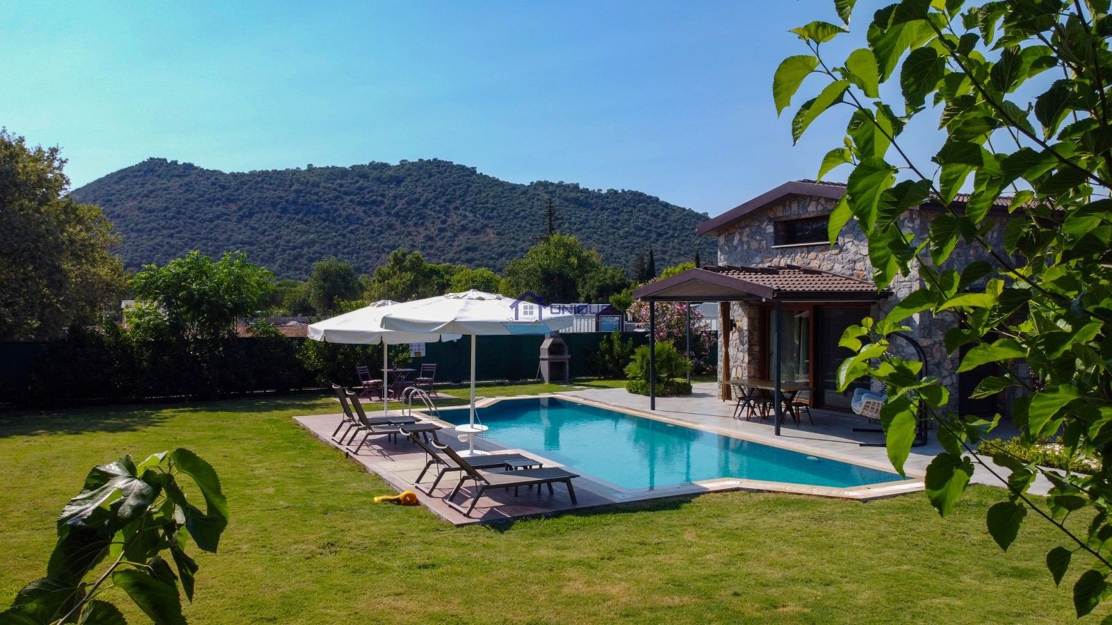 The villa features a fully sheltered private swimming pool and a landscaped garden. It is highly suitable for guests searching for a conservative family villa in Fethiye or a peaceful holiday rental in Turkey.