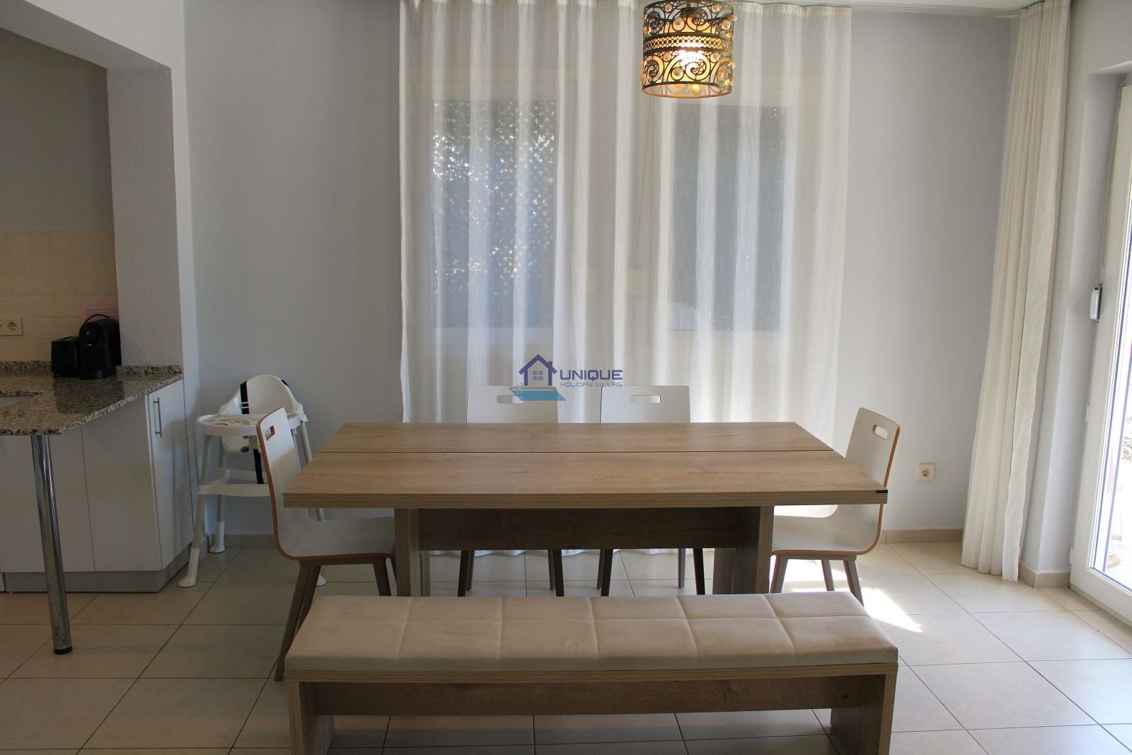 Ground Floor: The ground floor features a fully equipped open-plan kitchen, a dining area, and a bright living room with comfortable seating and an LCD TV. A guest WC and washbasin are also located on this floor.
